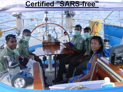 There was a funny moment as the boatload of Customs agents came out to check us in. When they saw Ariel, who if you haven’t noticed, is Chinese, they all immediately donned surgical gloves and masks! Later, I found out that this is really a new anti-SARS policy and they say they must do this for all yachts, not just those with Chinese on board….!