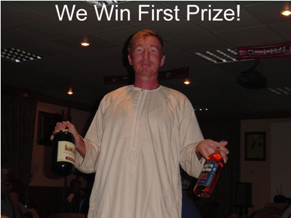 At the end of the evening they totaled the score and our team, ‘The Woodbridge Anchors,’ won! I mean we wiped the floor with the locals as the score wasn’t even close. I thought we would have to fight our way out of there but it was all taken in good humor. Our first prize was a bottle of wine and a nice fifth of scotch (see picture).